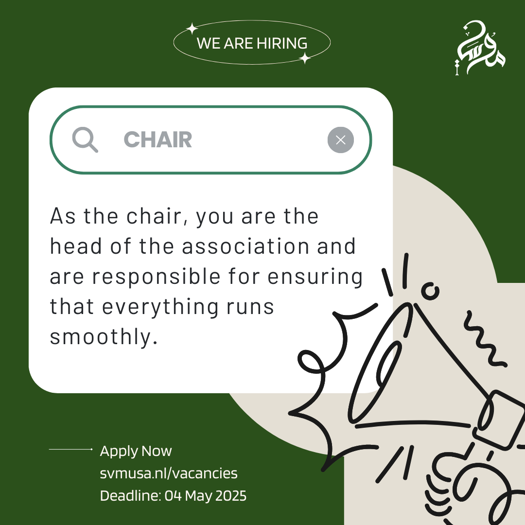 Ben jij een geboren leider met een passie voor community building? Wil jij een centrale rol spelen in het sturen van een dynamische studentenvereniging en het vertegenwoordigen van moslimstudenten aan de Universiteit van Amsterdam? Als voorzitter van svMUSA neem je de leiding in het coördineren van het bestuur en het bepalen van de visie en richting van de vereniging. Je houdt toezicht op het algemene functioneren van de organisatie, ondersteunt de andere bestuursleden en vertegenwoordigt svMUSA zowel intern als extern. Dit is een zeer waardevolle rol voor iemand met een sterk verantwoordelijkheidsgevoel, visie en toewijding aan de moslimgemeenschap op de universiteit.